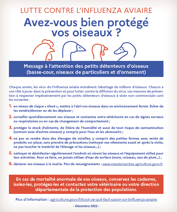 ALERTE Passage au niveau risque élevé IAHP (Influenza aviaire Hautement Pathogène)